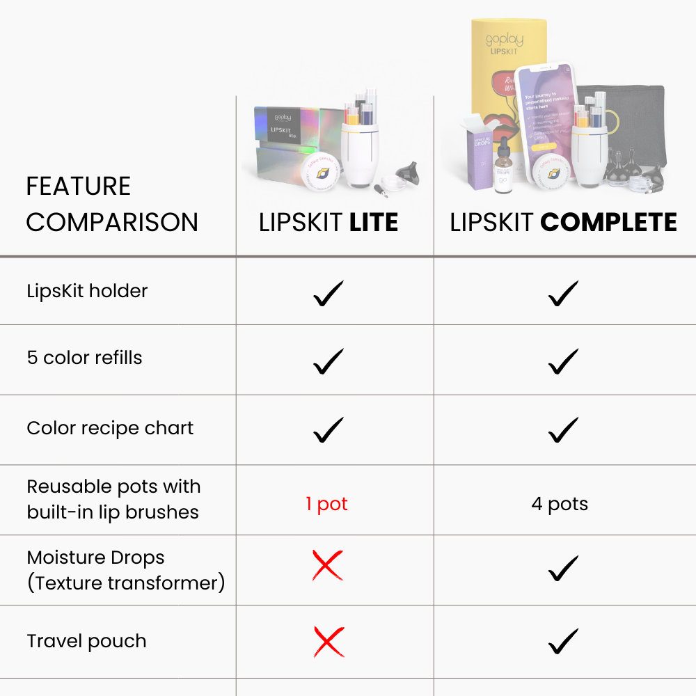 Compare GoPlay LipsKit Complete, LipsKit Lite and bundles to find your perfect DIY lipstick kit.